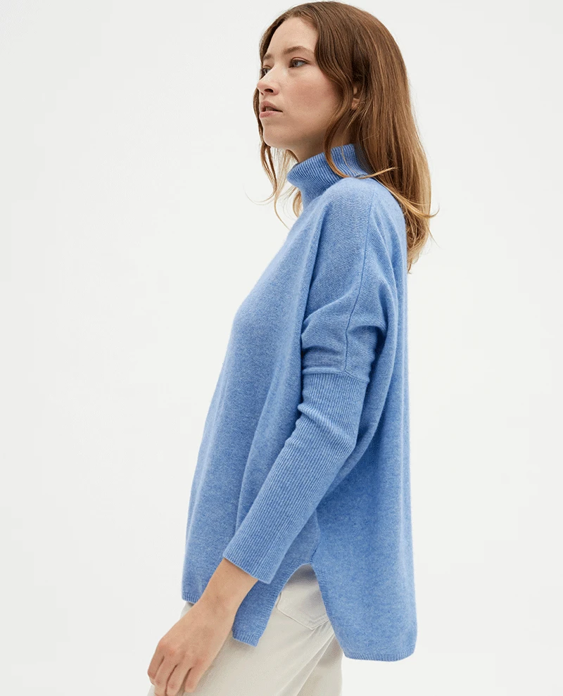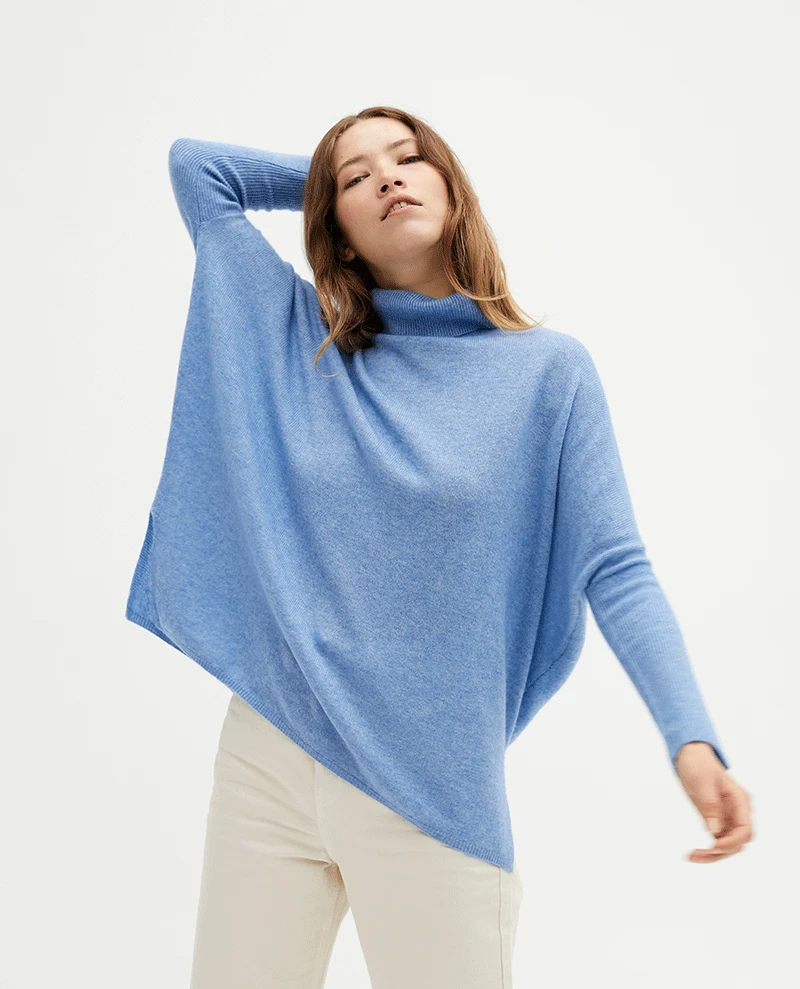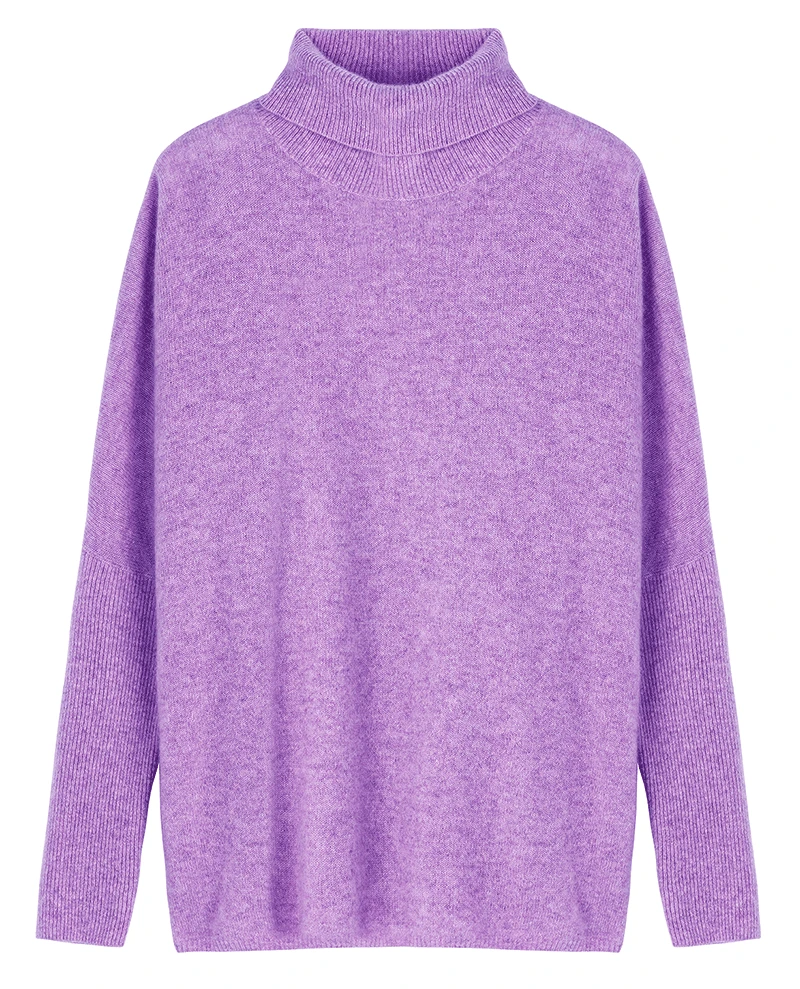 Absolut Cashmere Clara Lilac Knit, a light purple cashmere jumper with an oversized and wide poncho fit. This pastel purple knitted pullover has ribbed sleeves from the elbow to the cuff and a slit in the side seams. A super soft and cosy sweater with an oversized fit and a high roll over turtle neck.