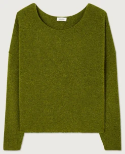 American Vintage Damsville Marais Green Knit, a stretchy andĀ oversized olive green knitted sweater with long sleeves and a wide round neck. Loose and casual the Damsville pullover jumpers are a perennial favourite at Biscuit, available in an array of colours they are very much a wardrobe staple. Soft and slightly fluffy the comfortable shape resembles a sweater and the lightweight wool blend is ideal for all year round wear.Ā