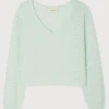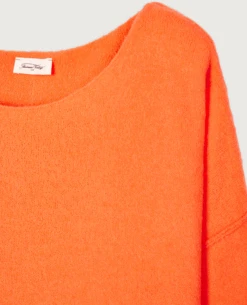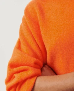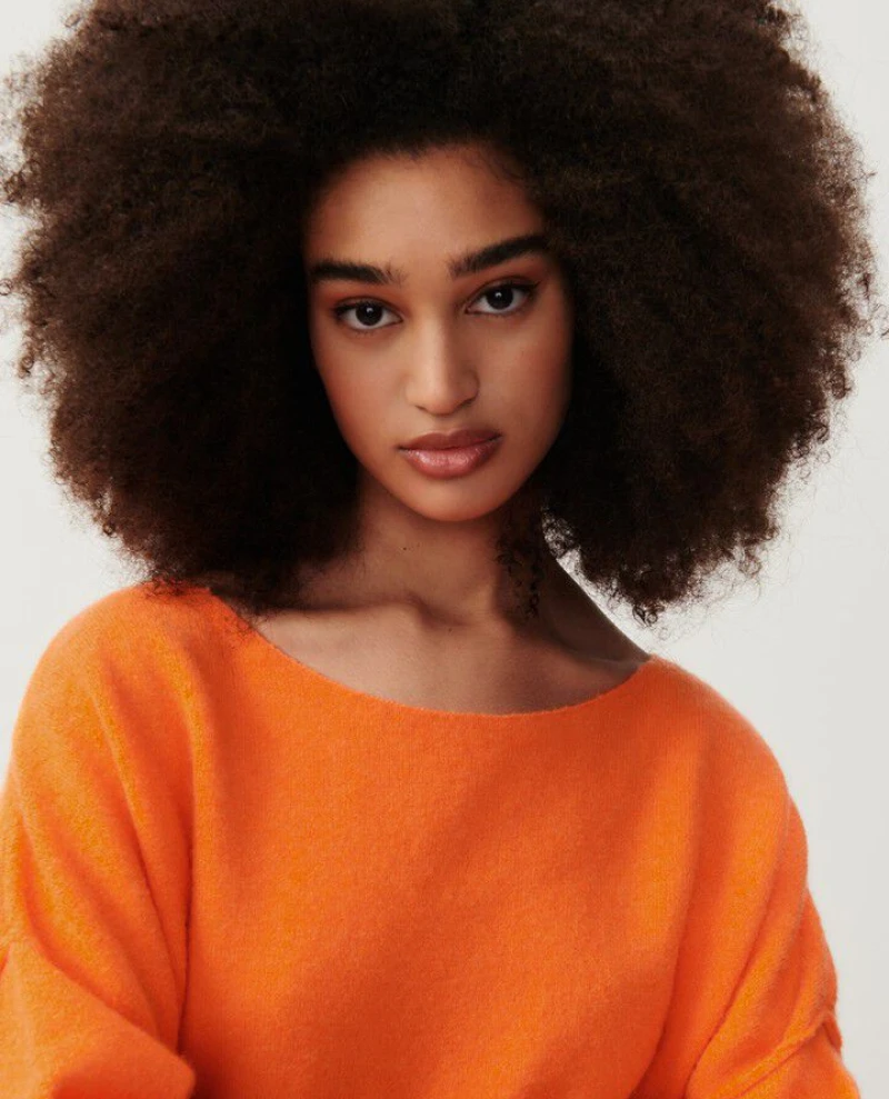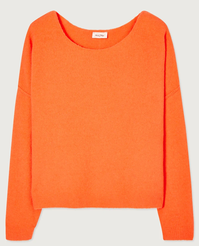 American Vintage Damsville Orange Knit, a stretchy oversized knitted sweater with long sleeves and a wide round neck. Loose and casual the Damsville pullover jumpers are a perennial favourite at Biscuit, available in an array of colours they are very much a wardrobe staple. Soft and slightly fluffy the comfortable shape resembles a sweater and the lightweight wool blend is ideal for all year round wear.Ā