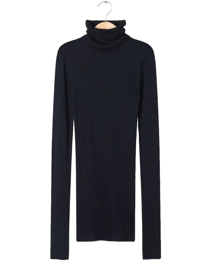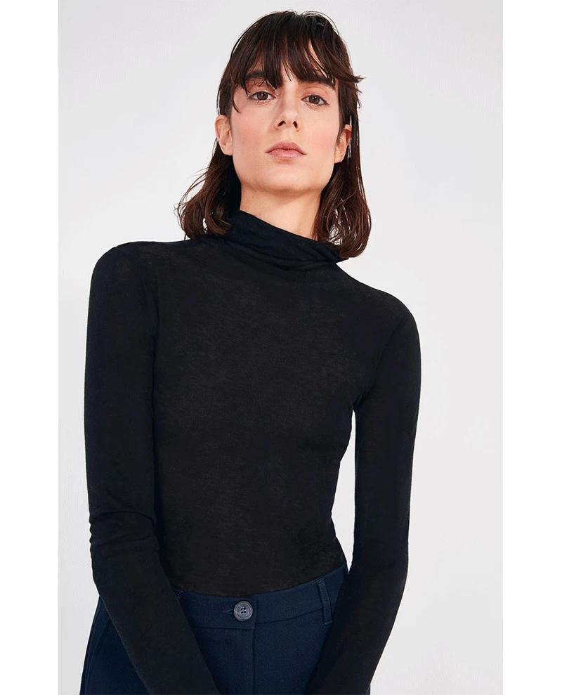 American Vintage Massachusetts Black Rollneck, a thin black polo neck tee with long sleeves and a figure hugging fit. This stretchy lightweight t-shirt can be worn alone or layered under other pieces for an extra layer in Autumn. Also available in light and bright pink.Â