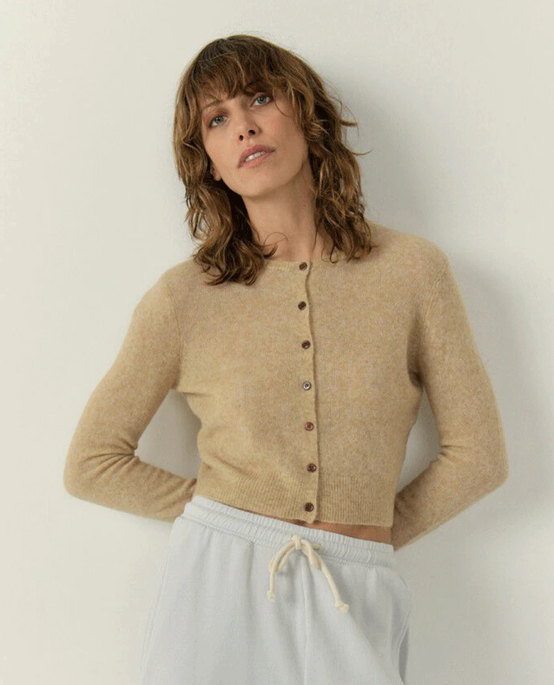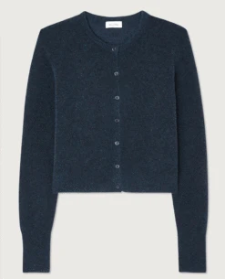 American Vintage Razpark Abyss Cardigan, a dark navy blue knitted cardigan with long sleeves and a round neck. Short in the body this cropped button down pullover has added stretch and a row of tonal navy buttons running down the front. Also comes in pink.Â