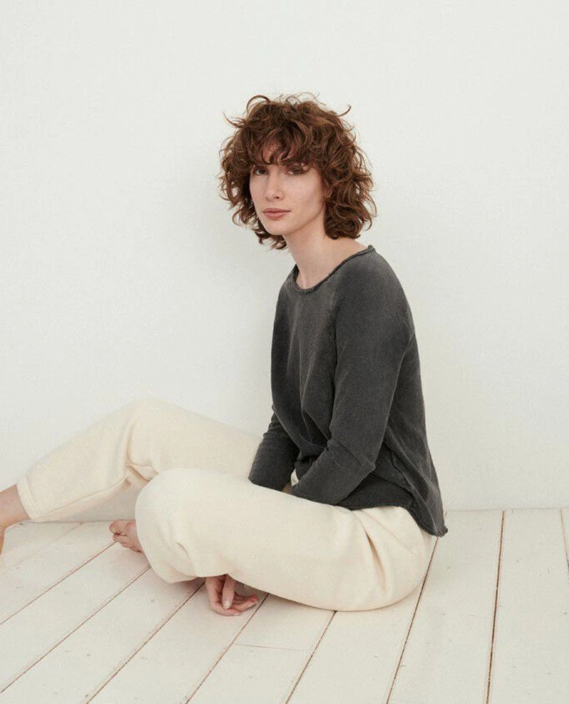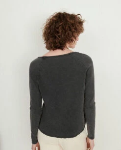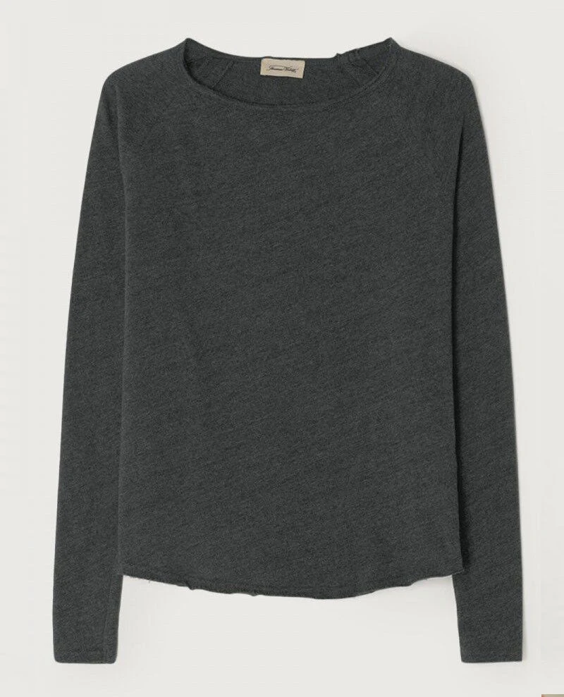 American Vintage Sonoma Vintage Black Top, a dark charcoal grey long sleeved cotton tee with a round wide neck and a straight relaxed fit. This simple dark grey pullover top is crafted from thick cotton, making it ideal for layering. The wide neck and hem are finished with raw edges giving it a casual feel. Also available in white, pink and blue.Â
