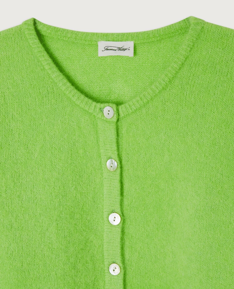 American Vintage Vitow Pistachio Green Cardigan, a soft and slightly fluffy green knitted cardigan with long sleeves and a round neck. Fastening down the front with a row of pearl shell buttons the Vitow pullover has a short fitting body and casual dropped shoulders.Â