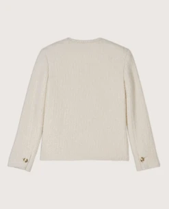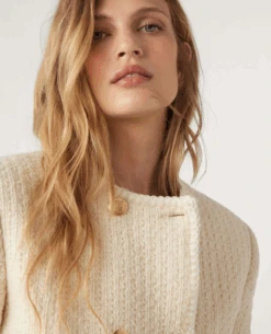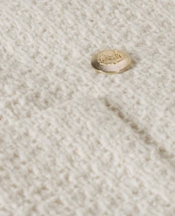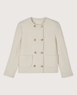 The Joe jacket is timeless classic. In neutral cream, it has a round neck and long sleeves, with a double-breasted button fastening at the front. The buttons are golden to catch the light and the collar and button placket have a decorative trim. This jacket is specially designed to add an elegant touch to all your outfits.