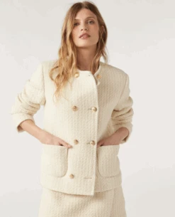 The Joe jacket is timeless classic. In neutral cream, it has a round neck and long sleeves, with a double-breasted button fastening at the front. The buttons are golden to catch the light and the collar and button placket have a decorative trim. This jacket is specially designed to add an elegant touch to all your outfits.