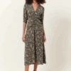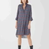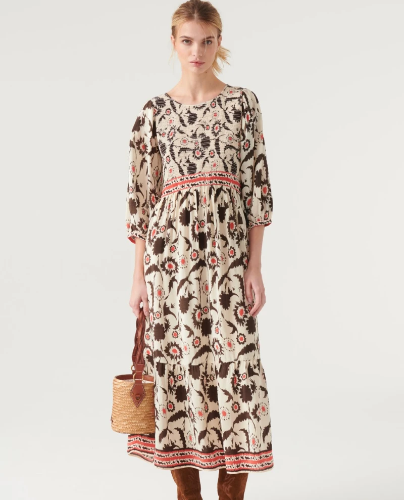 Ba&sh Katel Cream Dress, a patterned dress in midi length. Featuring a navy and red decorative pattern on neutral ecru, the Katel has an easy fit with simple rounded neckline and 3/4 length, cuffed sleeve.