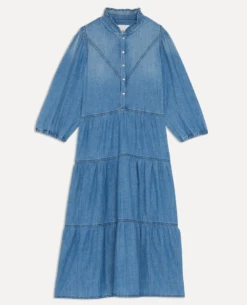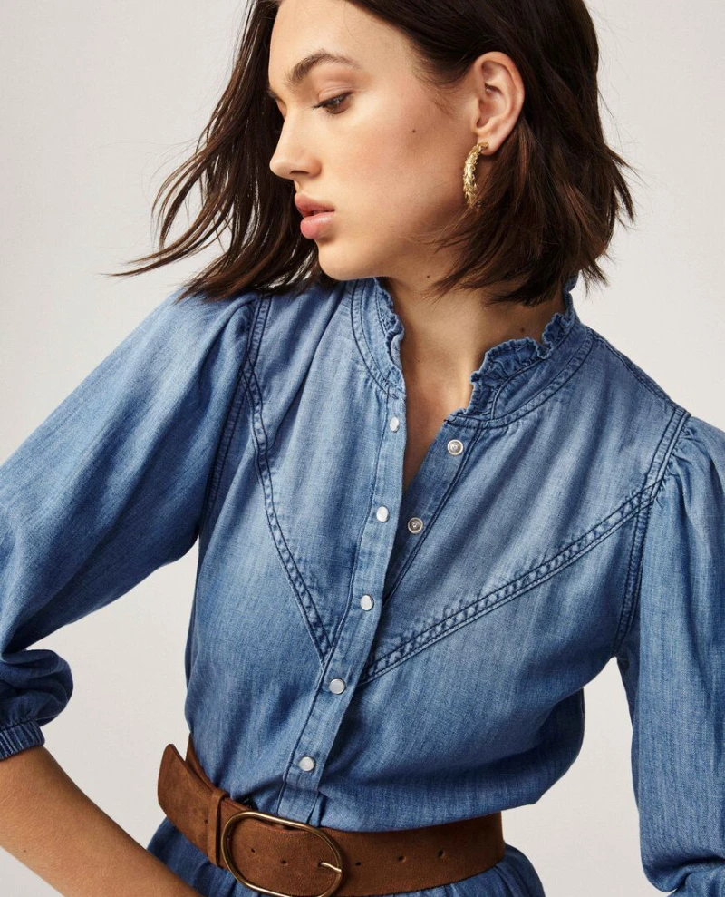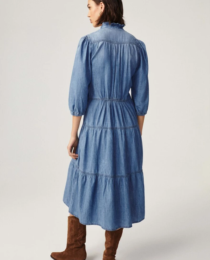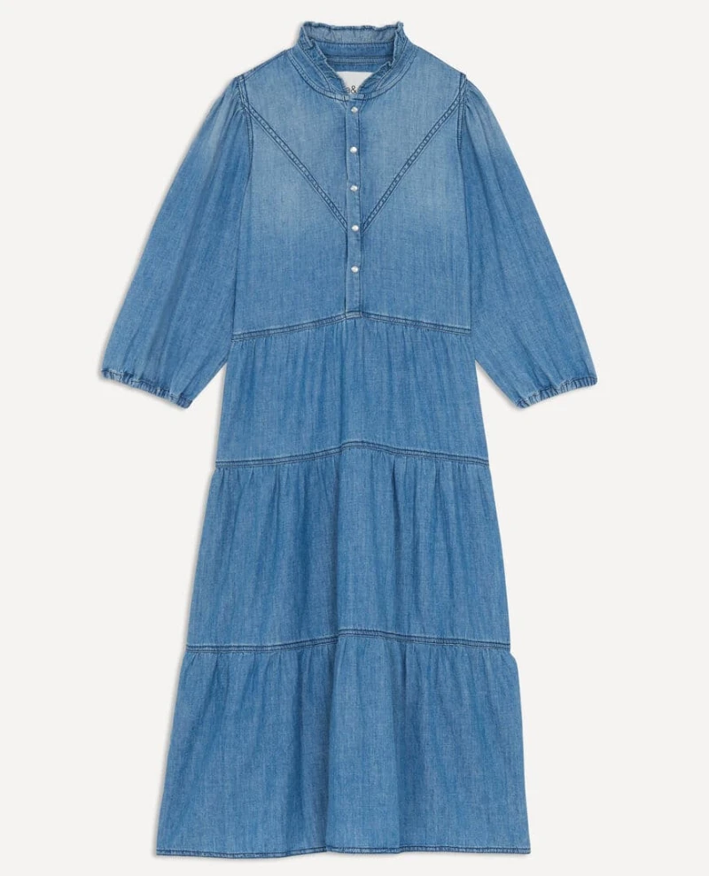 Ba&sh Willow Blue Dress, a new version of the brand’s legendary midi dress in a relaxed denim finish. The top has a short ruffled standing collar and 3/4 elasticated sleeves. It then extends into a midi dress with a gathered, tiered skirt. In supple, lightweight denim like chambray, this is an easy dress for year-round wear.