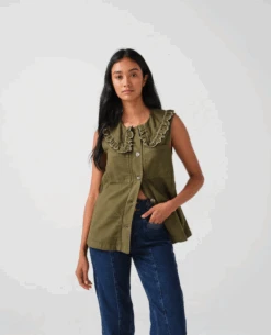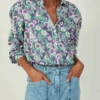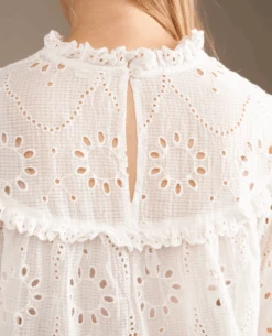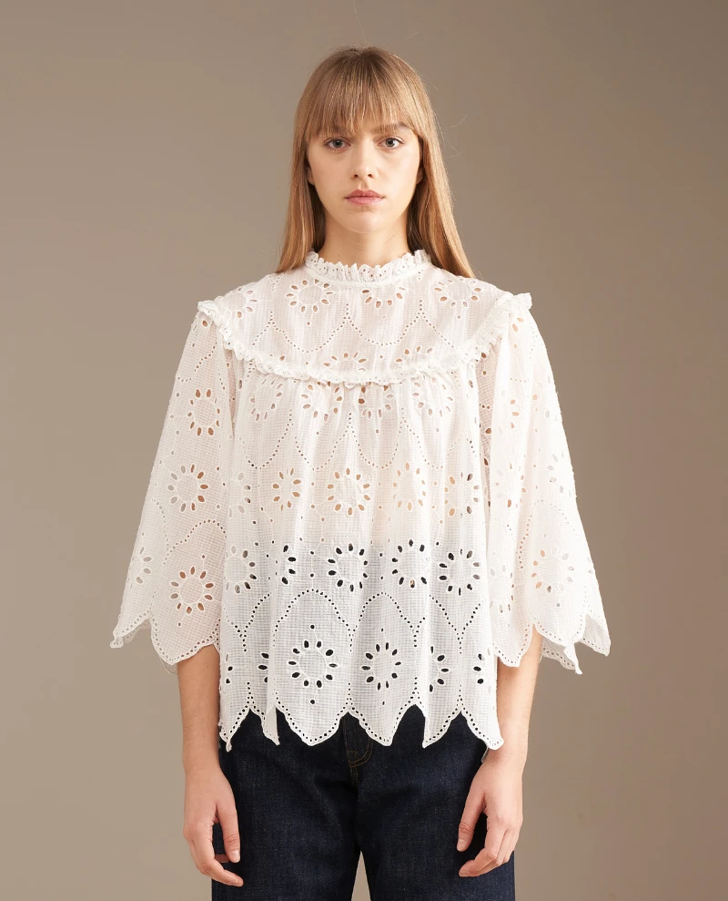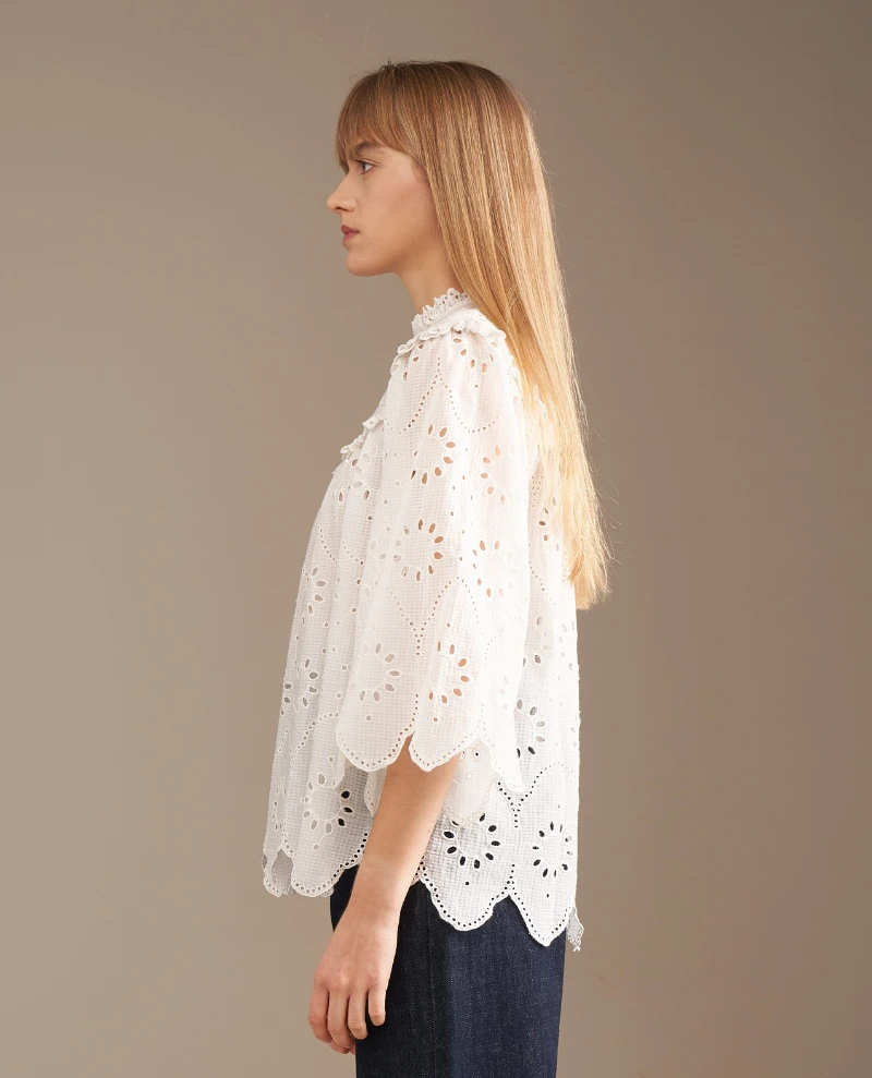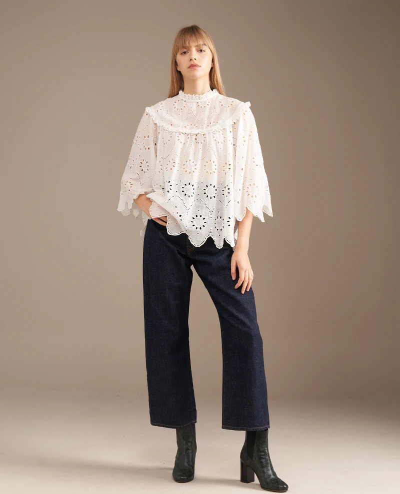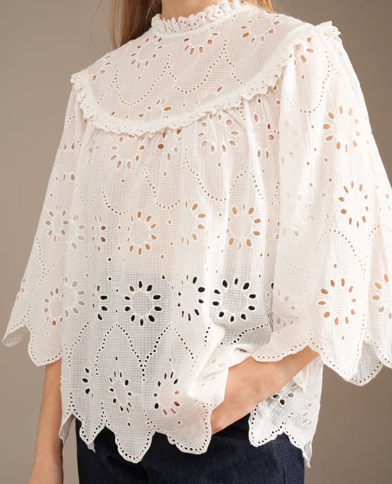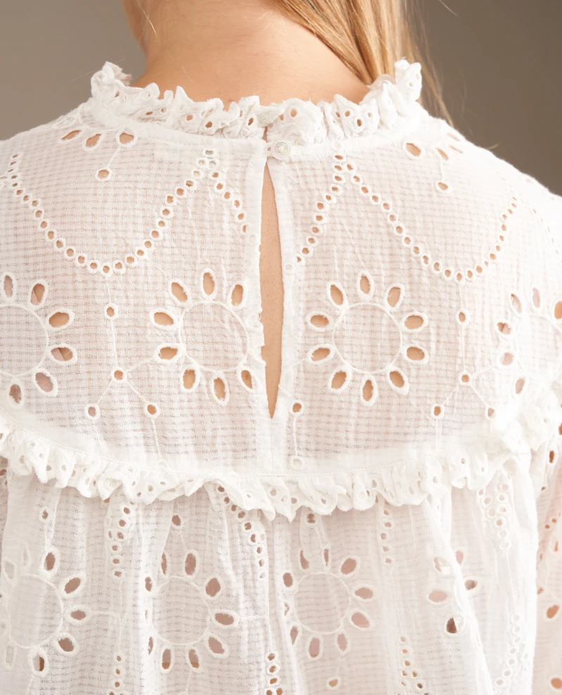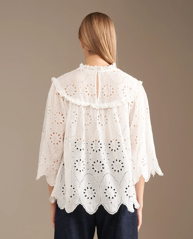 Bellerose Calais Natural Blouse, a delicate blouse with cut through embroidery detail. In a romantic, relaxed style, the Calais Blouse has a high neckline, with wide 3/4 length sleeves and keyhole and button detail to the back.