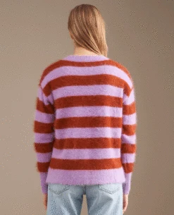 Bellerose Datipe Stripe Knit, a simple crewneck knit is dual tone. With a fluffy texture, the Datipe knit has long sleeves and side slits for comfort. Finished in purple and red horizontal stripe.