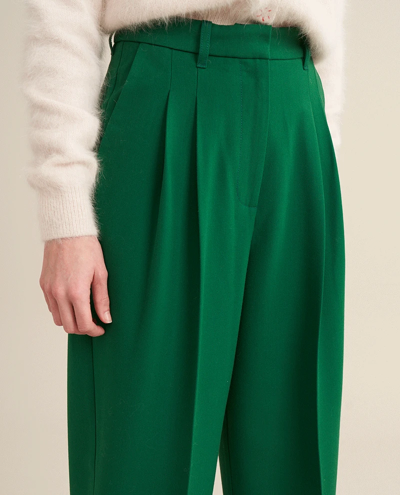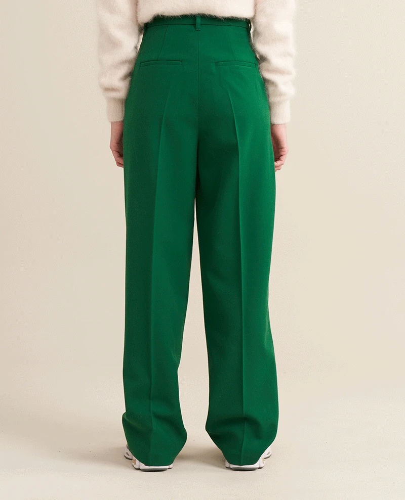 Bellerose Dominic Adventura Green Trousers, a tailored trouser. Made from an eco-friendly blend of polyester and viscose, the Dominic trousers are cut with a high-rise and wide-leg for a timeless and versatile silhouette.Â