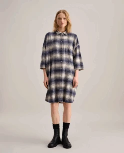 Enhance your wardrobe with the Bellerose Gladys Blue Check Dress: a timeless shirt-style dress featuring a bold check pattern and a classic long sleeve and collar detail. The dress is crafted from a red and black color palette which falls to the knee. A button closure secures the dress at the centre front.