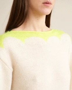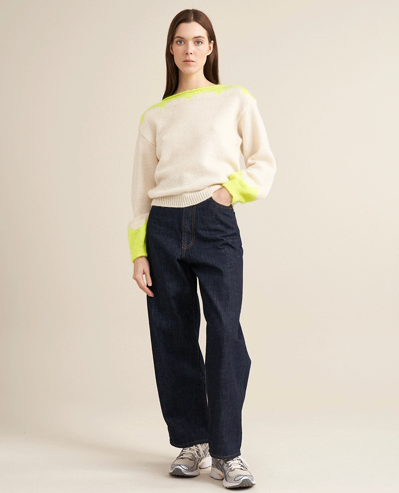 Stay warm and stylish with the Bellerose Nanur Ivory Knit, a wool mix jumper with a modern contrast of soft cream and bright fluro yellow. This combo will instantly lift any outfit, while the rounded neckline, cuffed details and relaxed slouchy fit gives you all the comfort you need.