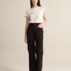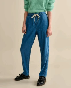 Bellerose Pizzy Vintage Blue Trouser, an easy-going and easy-fitting trouser crafted from a super soft Lyocell denim and featuring an elastic waist with a contrasting drawstring. Complete with tapered leg, wear them with the cuffs rolled and a pair of trainers.