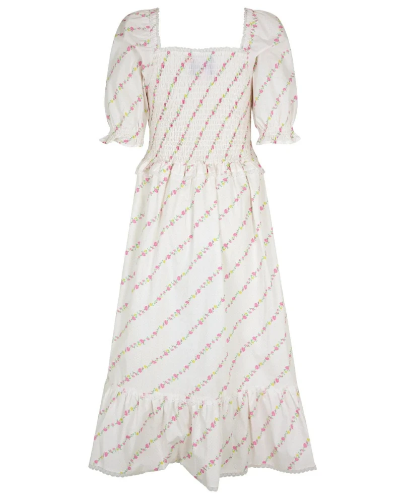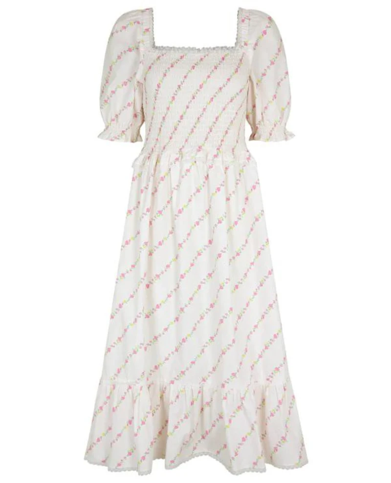 Cras Alaiacras Floral Dot Dress, a cute summer dress in neutral white with delicate floral print. With a squared neckline, smocking, and puff sleeves, the Alaicras dress has a midi length and floaty skirt with frill detail to hem and sleeves.