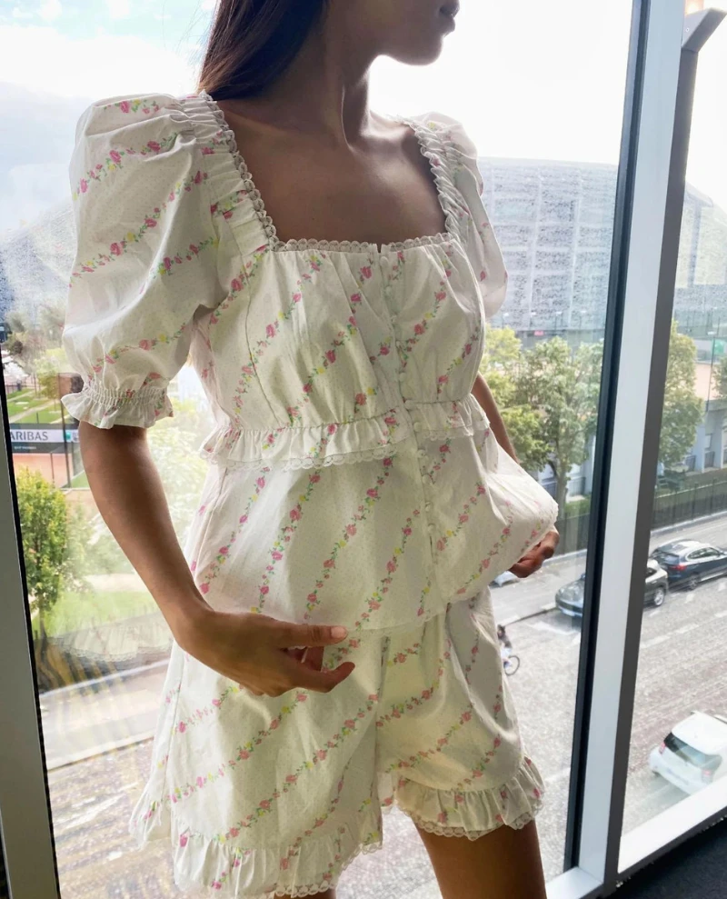 Cras Alessiacras Floral Dot Blouse, a cool, lightweight blouse in neutral white. Complete with delicate floral print, the Alessia blouse has a square neckline and elbow length, puffed sleeves. Complete with lace trims.