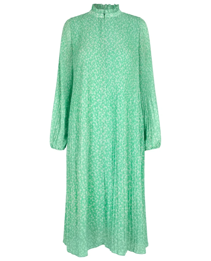 Cras Binacras Flora Mint Dress, a loose fitting pleated dress with floral print. Complete with long sleeves and frill detail to the neck, there is a hidden sipper closure to the neck.