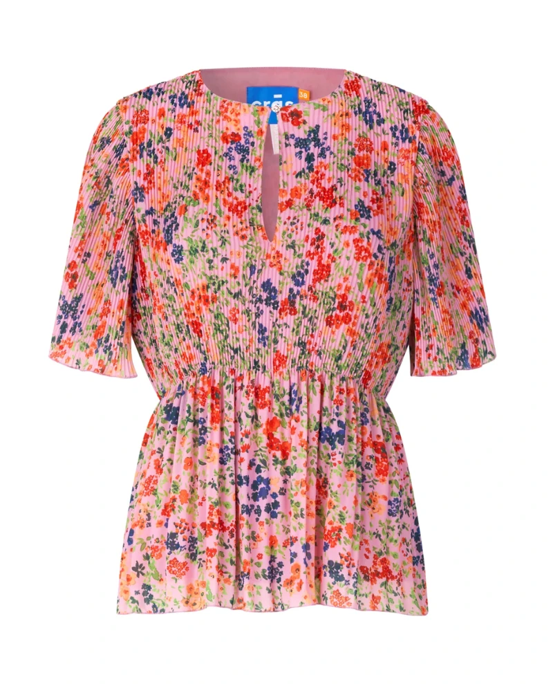 Cras Bonniecras Orange Meadow Blouse, an elegant pleated blouse with delicate floral print in colourful prink and orange. Complete with elasticated waist, keyhole opening and short, pleated sleeves.