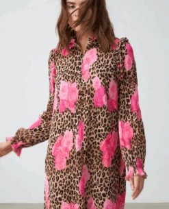 The Cras Britta Rose Leopard Dress offers a unique and stylish look for any occasion. Crafted from 100% recycled polyester, this dress has a flattering loose fit and pleated design with stylish frill details at the neck and shoulders. Long sleeves provide extra coverage.