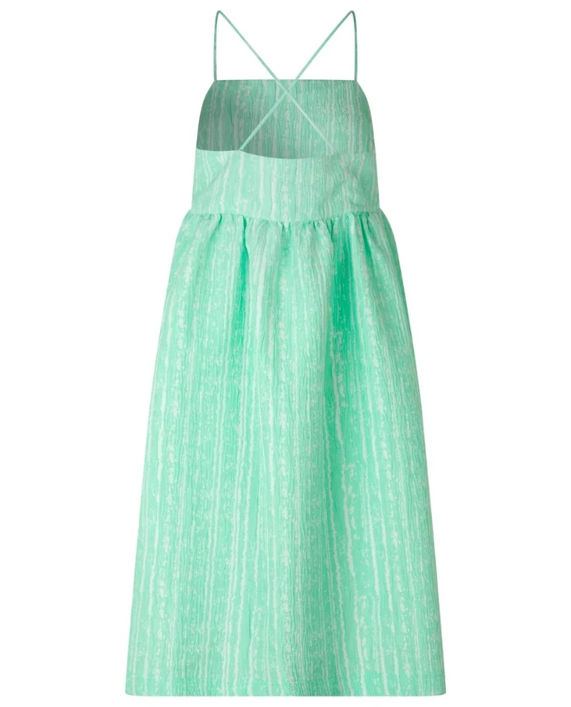 Cras Sadiecras Spring Mud Dress, a voluminous strappy dress in a slightly structured fabric. In a fresh green, the Sadiecras dress has a cross back and wide skirt.