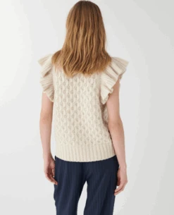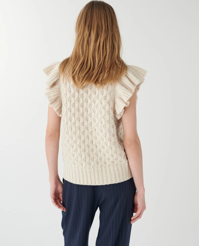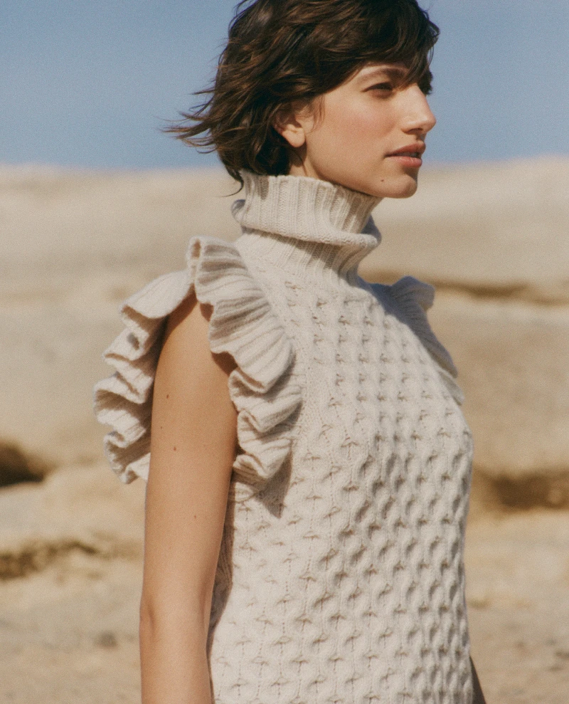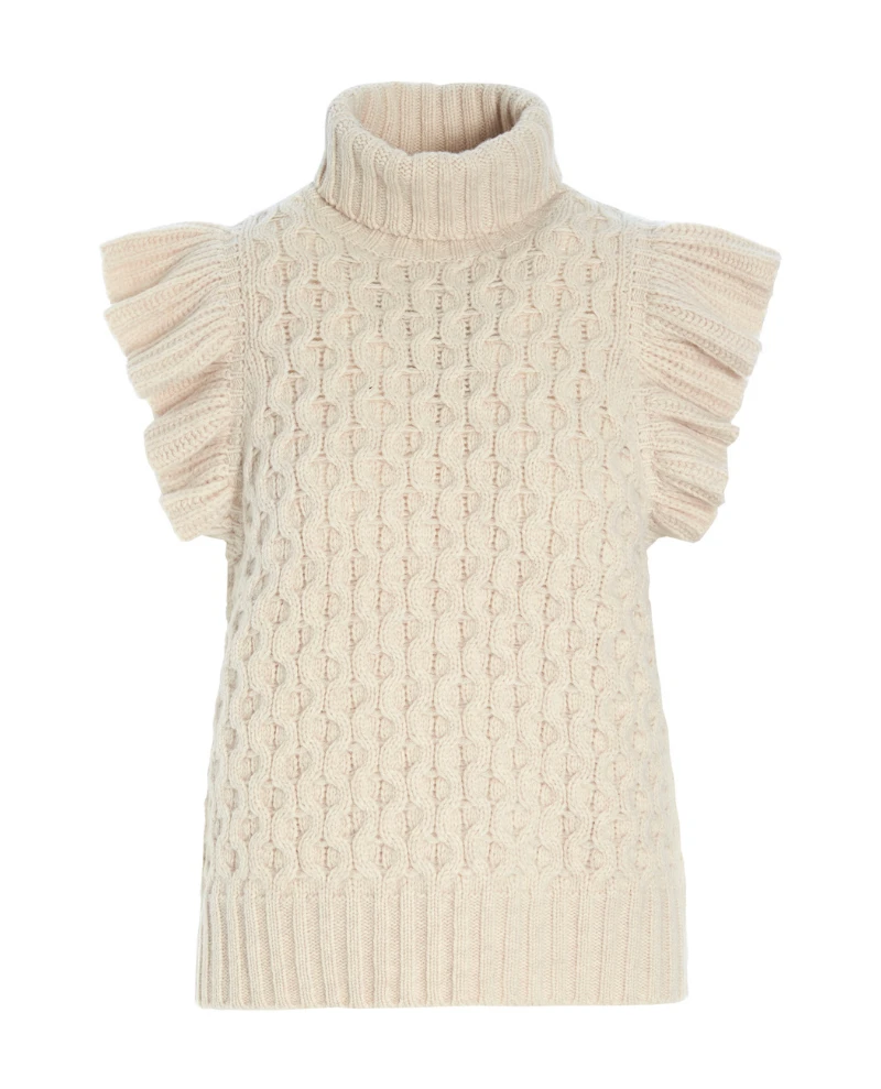 Experience luxurious warmth and timeless style with the Dea Kudibal Britthie Sherling Sweater Vest. Crafted with a neutral wool blend, this vest features a roll neck collar and textured cableknit front, combined with oversized ruffle sleeves for an elevated, timeless look. Stay warm in style with this timeless winter vest.
