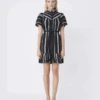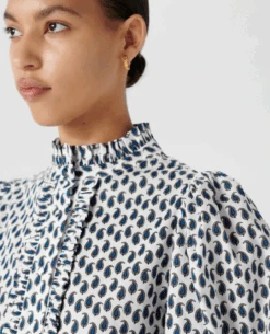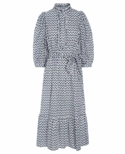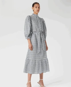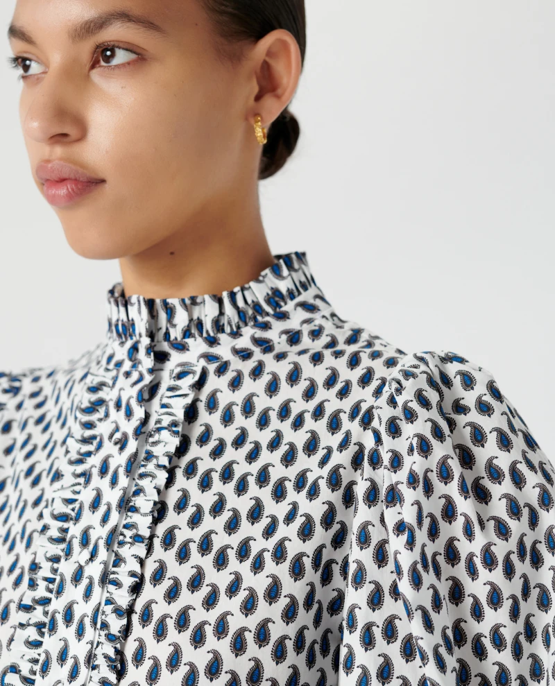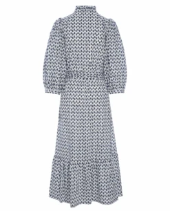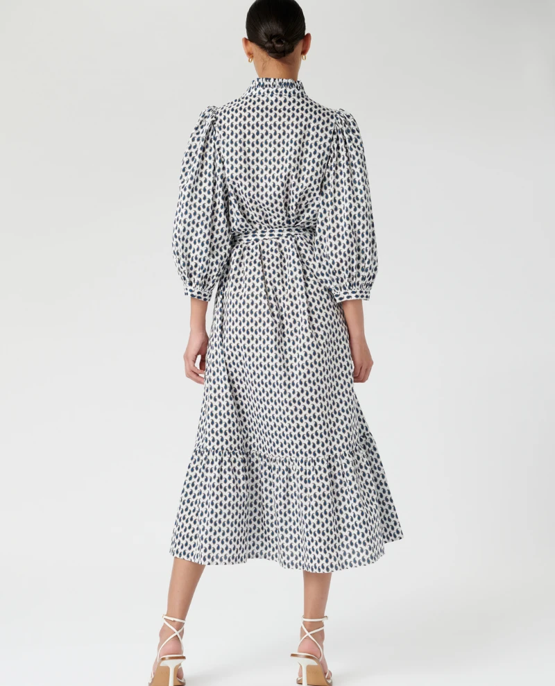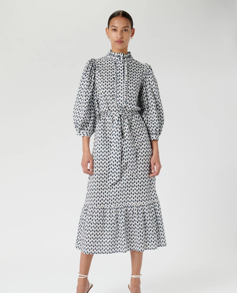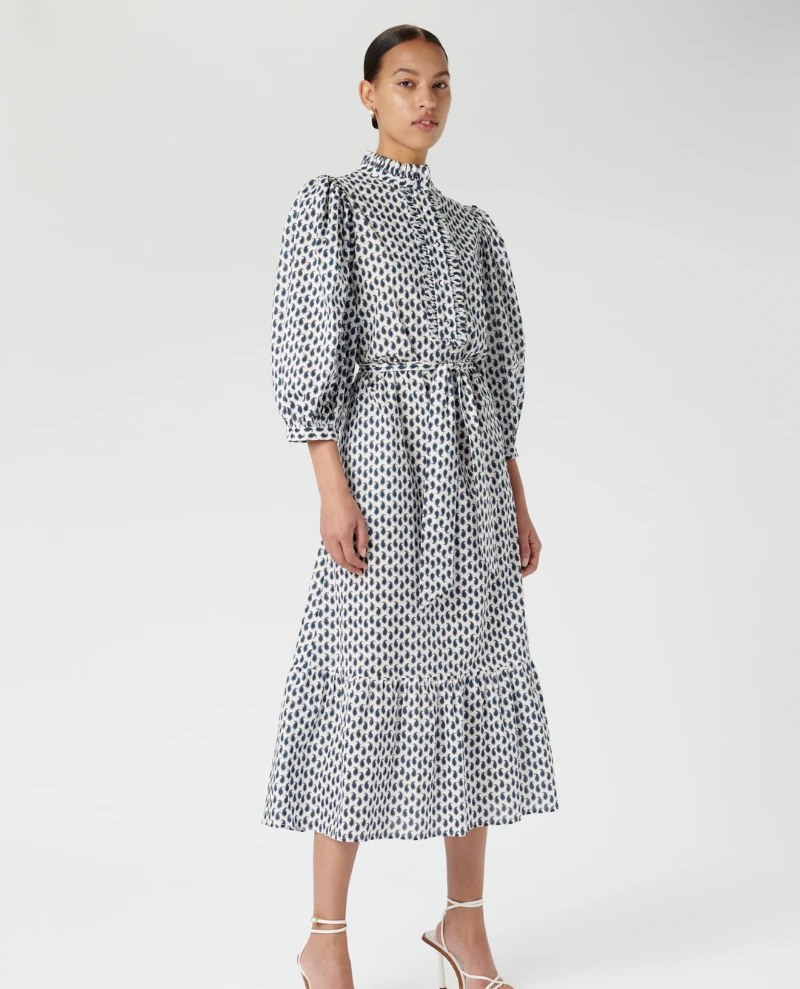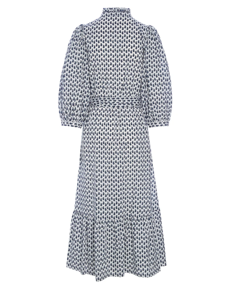 Dea Kudibal MY Petite Dress, a crisp cotton dress with ruffle detail and balloon style sleeves. With monochrome paisley print, the dress has a buttoned placket to front and stand collar. The relaxed shape is pulled in at the waist with a tie belt and the three quarter length balloon sleeves add a romantic flair.Â