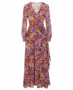 Dea Kudibal Vivian Flora Magent Wrap Dress, a vibrant printed floral dress. Flattering and comfortable, this long wrap dress with a flounce following the edge has a sense of drama that makes it perfect for a summer evening! With a v-neckline and close fitting bodice, the flared skirt has a layered effect!