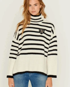 This striped knit is perfect for any occasion. Crafted with a loose fit and high collar with buttons, it provides all-day comfort and style. Breton stripes and embroidered badges give it a unique and timeless look. With its classic silhouette and meticulous design, the Five Black Ecru Stripe Knit is sure to be a wardrobe favourite.