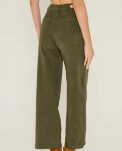 These Five Lucia Khaki Trousers offer a stylish, front-fastening design and pocket detail. The green flared legs and mid-to-high rise make for a flattering, comfortable fit. Perfect for any occasion.