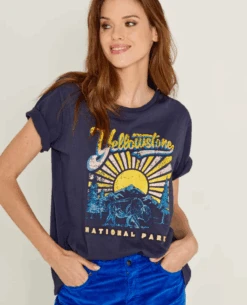 This round neck t-shirt is crafted from premium lightweight cotton for breathability and comfort. Its navy hue is embellished with a striking Yellowstone Park print to the front, making it a stylish addition to any casual wardrobe.
