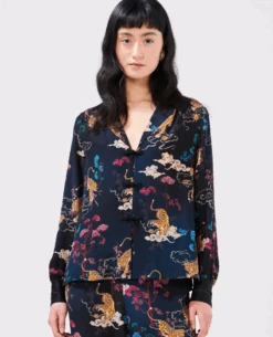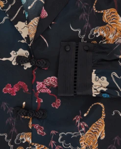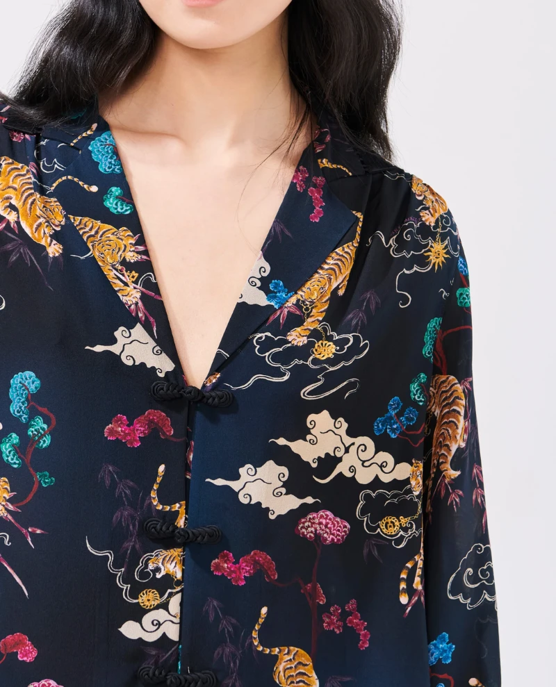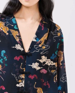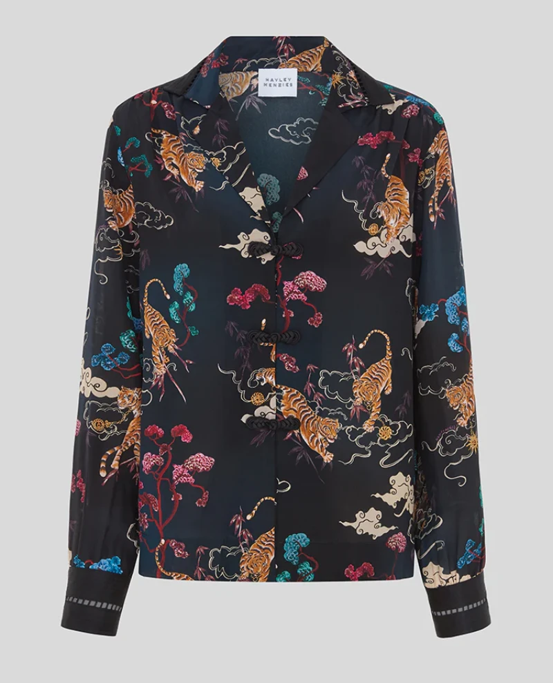 Inspired by the beauty of Asian art and landscapes, this Hayley Menzies Courageous Tiger Black Blouse combines laidback luxury with vintage-inspired chinoiserie. Crafted from 100% silk for a lightweight feel, the blouse is completed with hand made frogging style fastenings to ensure effortless glamour. Style with the matching trousers for a complete look.