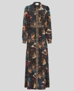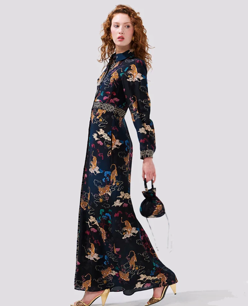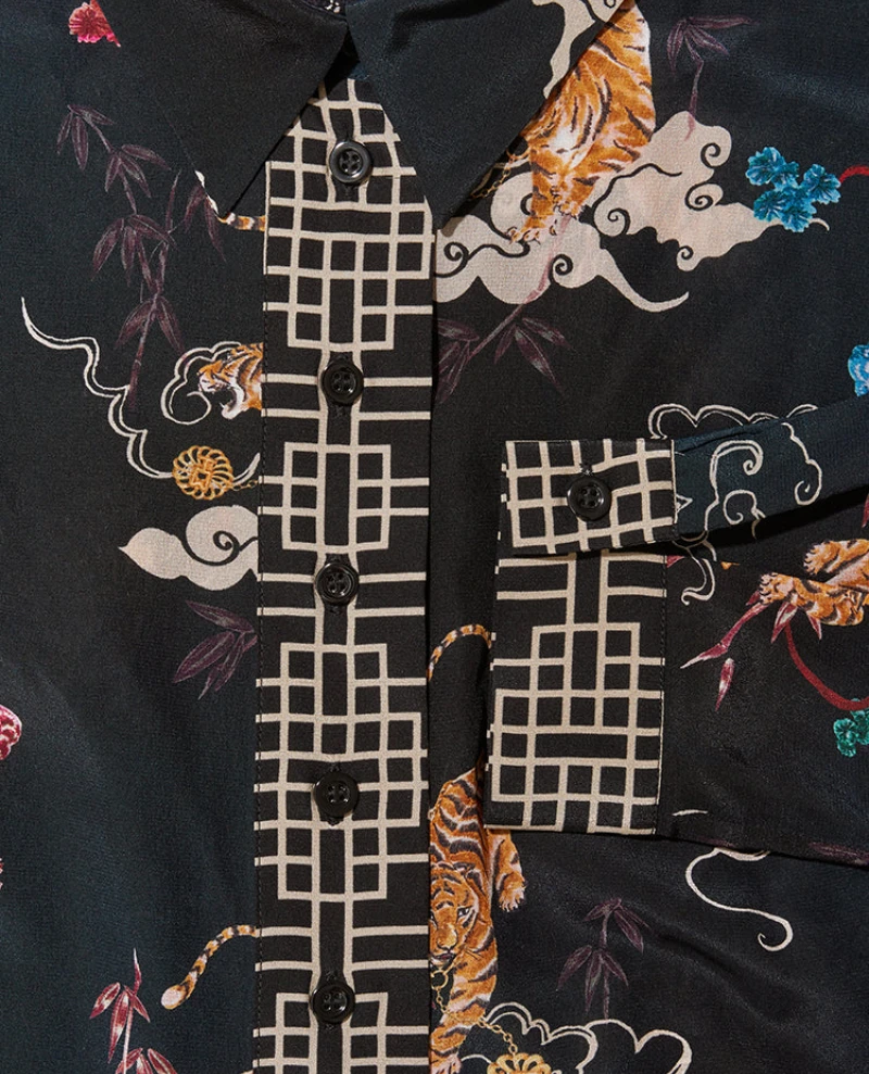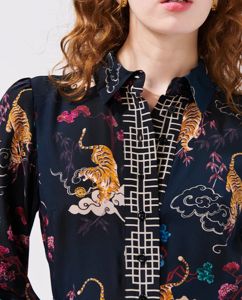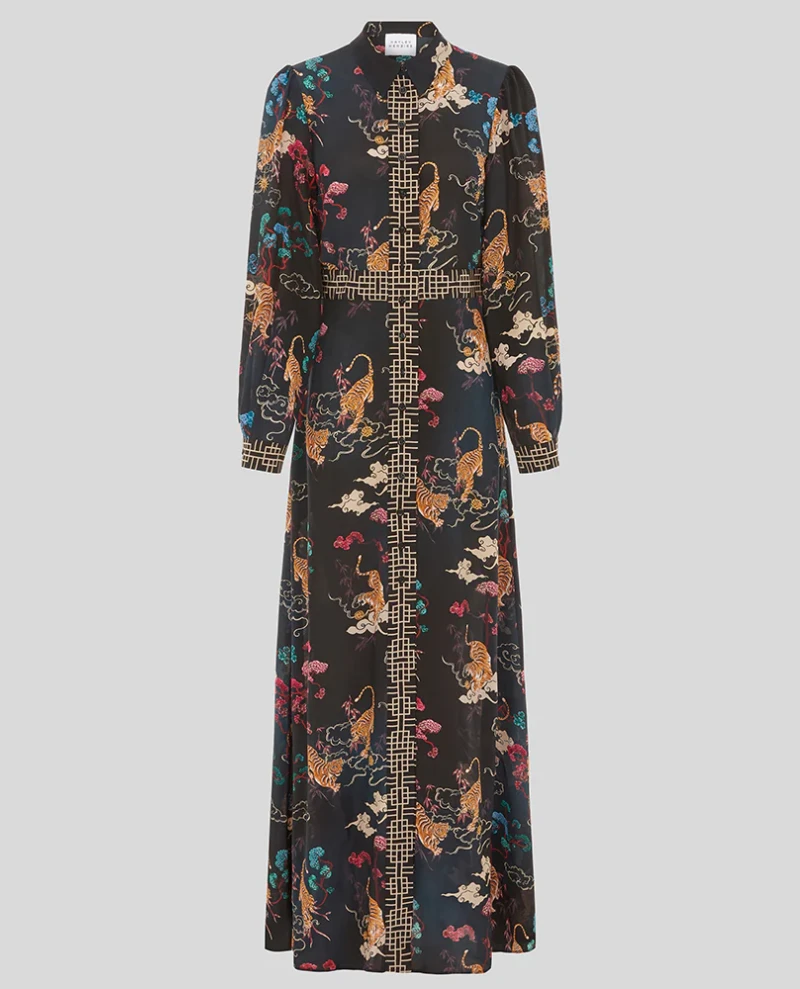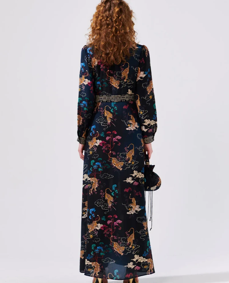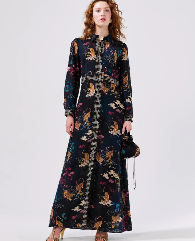 Be bold in the Hayley Menzies Courageous Tiger Black Dress. Crafted from responsibly sourced 100% silk and featuring a striking mid-century chinoiserie print, this maxi dress is the perfect bold statement piece for any occasion. With contrast plackets, waistband, and cuffs, your style will stand out in any crowd. Unleash your inner tiger and make a statement in this beautiful dress.