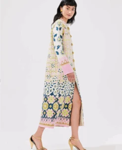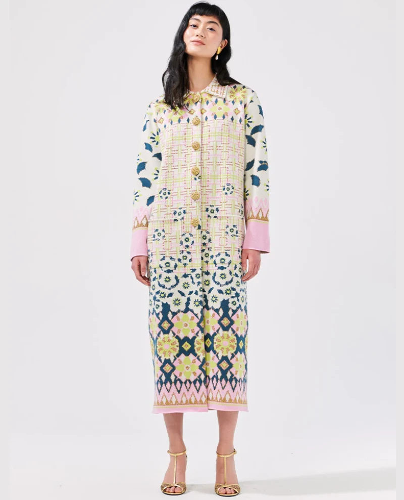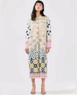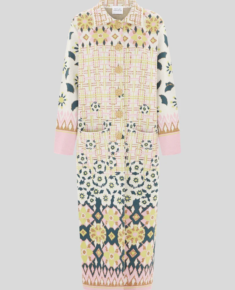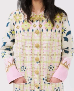 This Hayley Menzies Lattice Blossom Ecru Coat will make a timeless addition to your wardrobe. Woven with a soft cotton blend and finished with macrame buttons, it features the traditional Japanese and Korean wood windows pattern for a vintage-inspired silhouette. Gold lurex is added for a subtle shimmer, providing a classic look.
