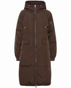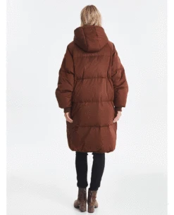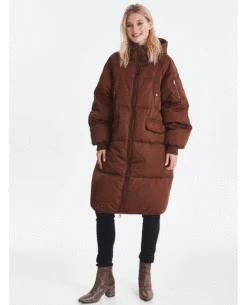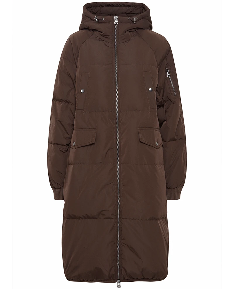 Ichi Bunala Java Brown Padded Jacket, a dark reddish brown oversized Winter jacket with long sleeves and a hood. This knee length coat has 5 pockets and a tonal zip running down the front. Warm and practical for cold weather the Bunala jacket also comes in navy.Â