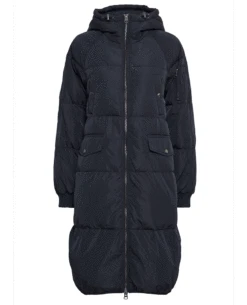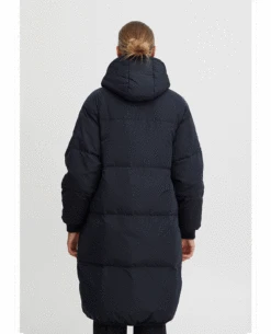 Ichi Bunala Navy Padded Jacket, a dark navy blue oversized Winter jacket with long sleeves and a hood. This knee length coat has 5 pockets and a tonal zip running down the front. Warm and practical for cold weather the Bunala jacket also comes in brown.Â