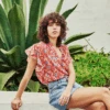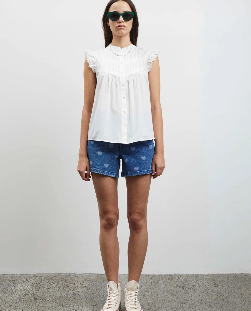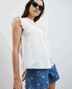 Ichi Fivaro White Shirt, a short sleeved blouse with button placket to front and frilled lace cap sleeves. In a neutral white, this will keep you cool all summer long!