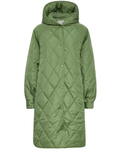 Ichi Hansa Winter Moss Jacket, a khaki green diamond quilted jacket with long sleeves and a hood. Falling to the knee in length this padded Autumn coat has a longer hem at the back and popper fastenings down the front. Complete with two pockets and stud poppers on the cuffs the Hansa light shower resistant jacket has a slouchy fit.
