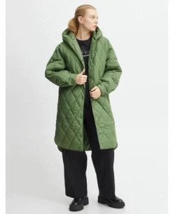 Ichi Hansa Winter Moss Jacket, a khaki green diamond quilted jacket with long sleeves and a hood. Falling to the knee in length this padded Autumn coat has a longer hem at the back and popper fastenings down the front. Complete with two pockets and stud poppers on the cuffs the Hansa light shower resistant jacket has a slouchy fit.