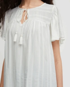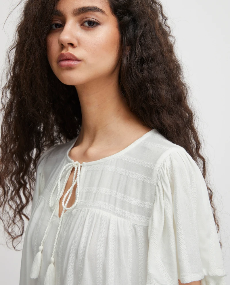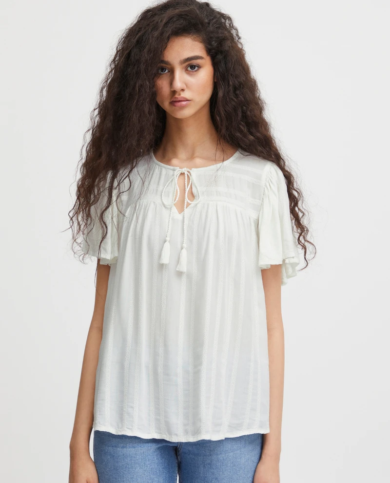Ichi Jannie Cloud Dancer Shirt, a lightweight cotton blouse in pale white tone. With short, floaty sleeves, the Jannie has a straight body with decorative tie detail to the neckline.