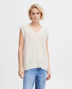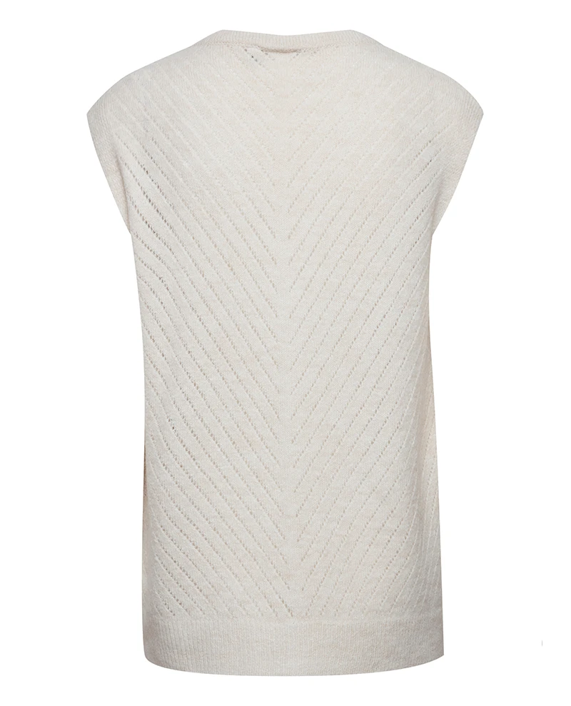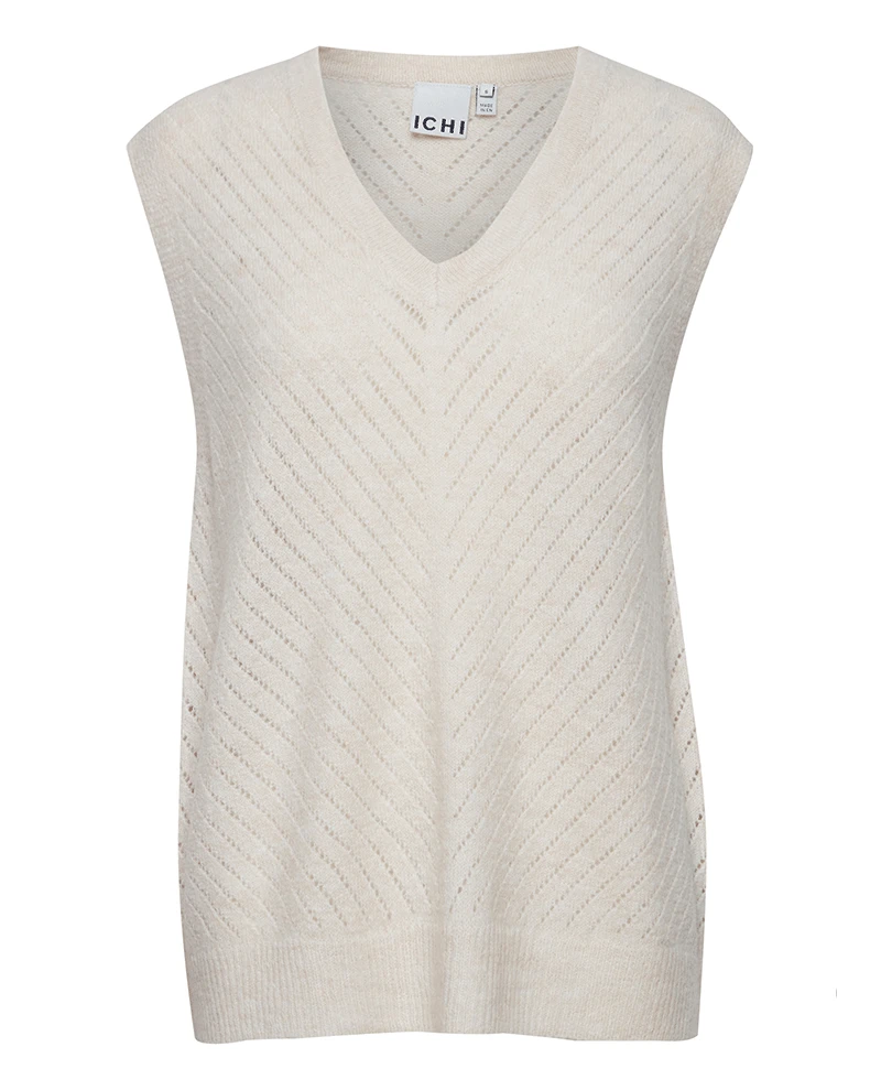 Ichi Kamara Cloud Sweater Vest, a slouchy and oversized off white knitted pullover with a v neck and no sleeves. Loose fitting the Kamara sleeveless sweater vest features subtle chevron pointelle detailing. A great layering piece for all year round wear. Â