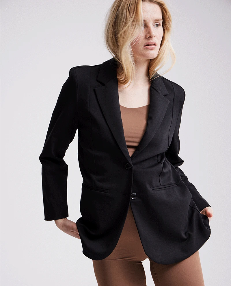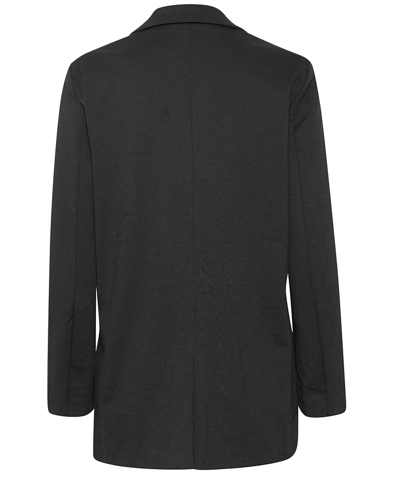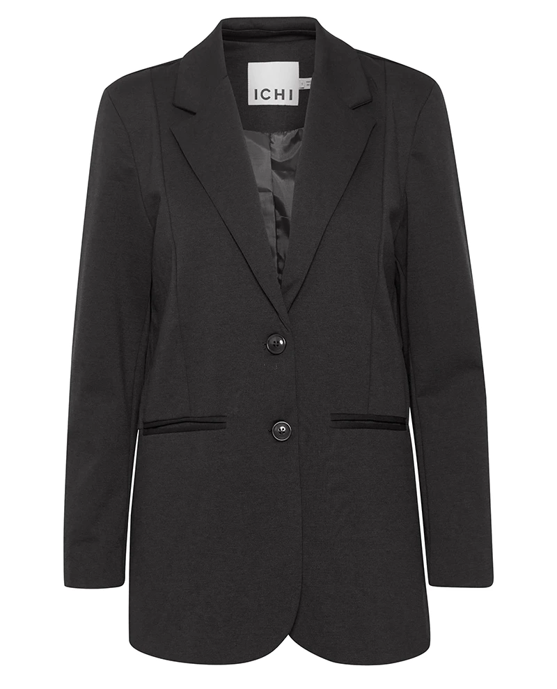 Ichi Kate Black Oversized Blazer, a long sleeved classic black blazer jacket with two black buttons and a pockets on the front.Â