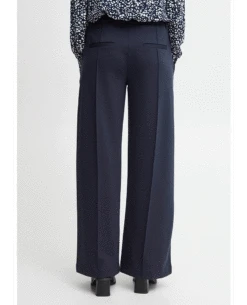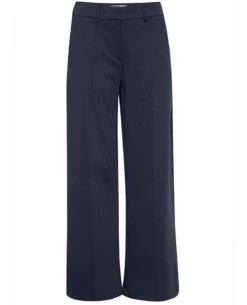 Ichi Kate Office Navy Trousers, a smart pair of dark navy blue wide leg trousers for casual everyday wear or a smart work look. Fastening with a zip and hook fastening these wide leg jersey pants have belt loops, pockets and added stretch.Â