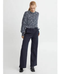 Ichi Kate Office Navy Trousers, a smart pair of dark navy blue wide leg trousers for casual everyday wear or a smart work look. Fastening with a zip and hook fastening these wide leg jersey pants have belt loops, pockets and added stretch.Â