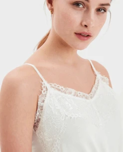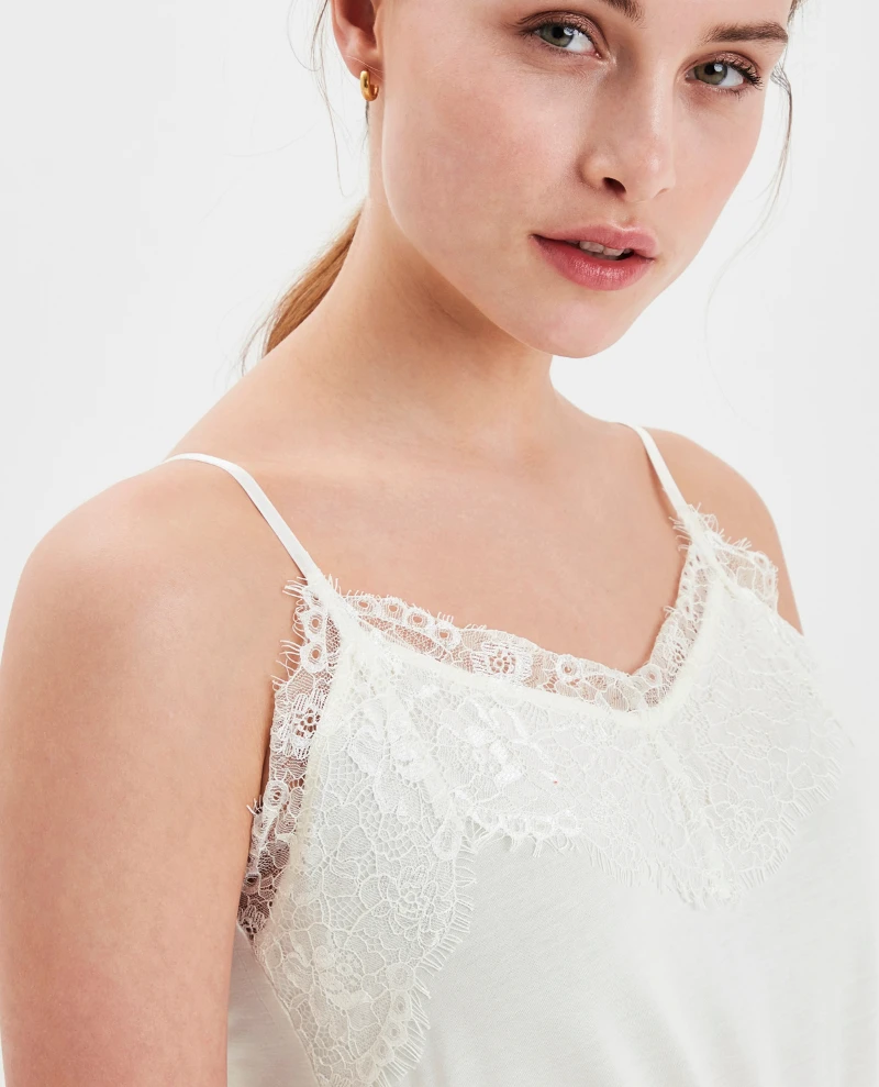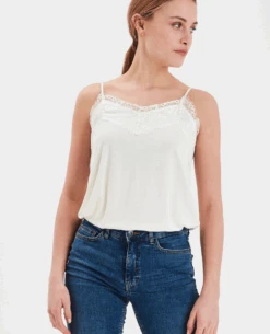 Ichi Like Cloud Dancer Top, a comfortable and lightweight camisole in neutral creamy white. Featuring detail lacing to the bust and slim straps, this is a versatile piece that can be layered beneath items year-round. Available in Pink and Black.