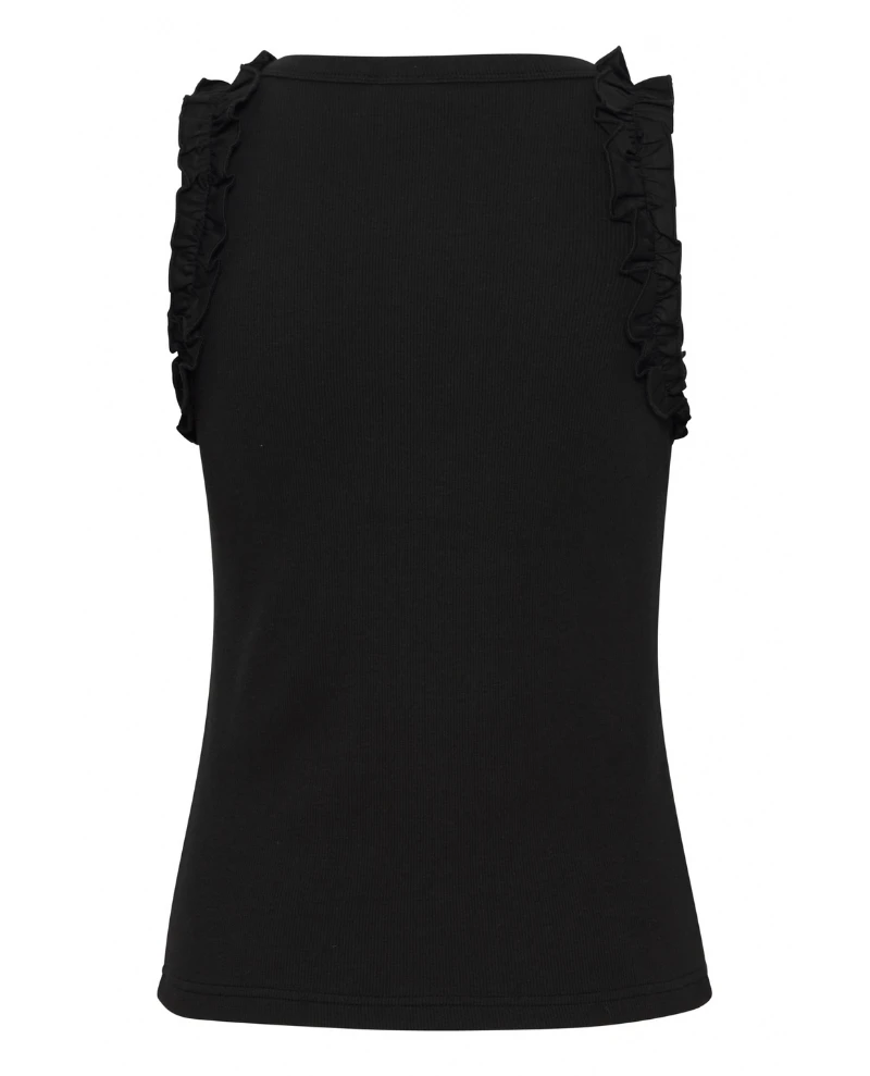Ichi Paityn Black Top, a minimalist vest style top in deep, neutral black. With a rounded neckline and sleeveless finish, the Paityn is an easy top to layer or pair with jeans or linen. Finished with frill detail to the shoulders.