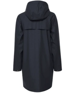 Ichi Tazi Navy Rain Jacket, a dark blue rain mac with long sleeves complete with adjustable black poppers on the cuffs. This rain proof Spring coat has a drawstring hood, patch pockets and a zip running down the front covered by a row of metal poppers. Practical and stylish this mid length coat falls to the knee in length. Also comes in green, pumpkin and grey.Â