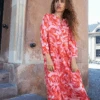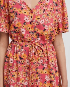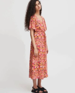 Ichi Vera Carmine Flower Dress, a bright floral print sundress. In a midi length, the Vera has all over Carmine print in zest orange, pink and red tones. With short sleeves and a v-neckline, it is finished with drawstring to the waist for a flattering silhouette.