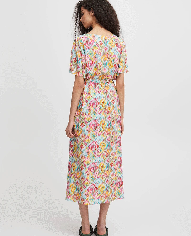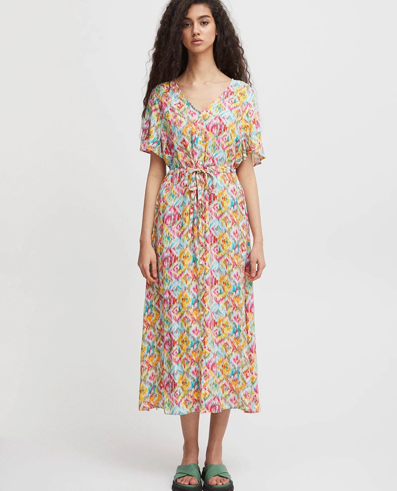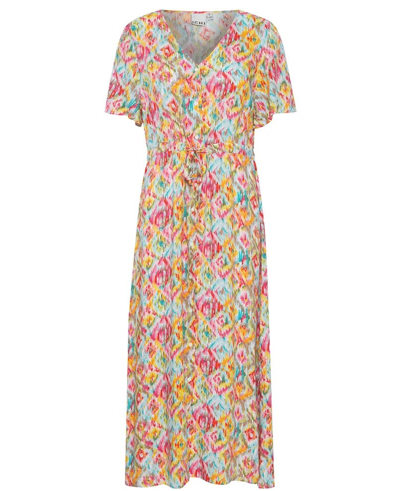 Ichi Vera Multicolour Dress, a multi-coloured midi dress with short loose sleeves and a v-neck. Tying at the waist with a thin tonal belt this mid length Summer dress has buttons running down the front and slits in the side hem.Â