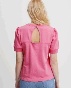 Ichi Yarla Super Pink Sweatshirt, a bubblegum tone crewneck with short sleeves. A simple design, the Yarla sweatshirt has a feminine cut out to the back. Pair with jeans and trainers for a casual look.