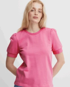 Ichi Yarla Super Pink Sweatshirt, a bubblegum tone crewneck with short sleeves. A simple design, the Yarla sweatshirt has a feminine cut out to the back. Pair with jeans and trainers for a casual look.