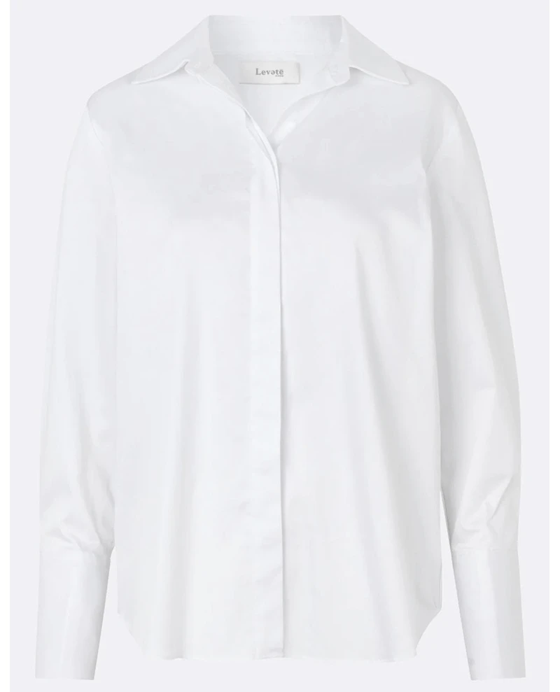Levete Room Isla White Blouse, a a crisp white long sleeved shirt with a pointed collar and a long loose fit. Crafted from organic cotton this soft classic button down shirt has a pleat on the back to ensure of flattering and easy fit.Â